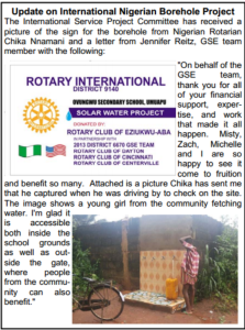 Four local young professionals help to build a water borehole project in Nigeria after returning from there in May 2013 on the Group Study Exchange through Rotary International – Michelle Harpenau, Executive Director of GCWAC, is one of the four team members who helped this happen in Nigeria.