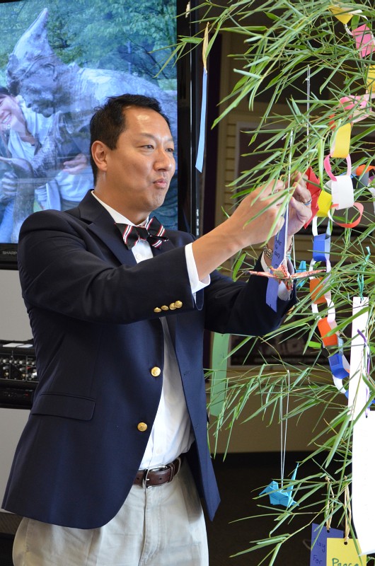 Around twenty people attended from several fields related with Japanese associations or educational institutions in this area to celebrate this memorial event. The bamboo tree decorated with the many pieces of paper written with wishes for peace, was displayed in the hall. This is the Japanese traditional custom called Tanabata. After the speech about world peace and the history of this project, the peace bell, which is the world’s largest free swinging bell, was rung and echoed all over the Cincinnati area across the Ohio River. The powerful, peaceful and deep resonant tone of the magnificent bell has continued to deliver the peaceful sound to people’s mind in the area.