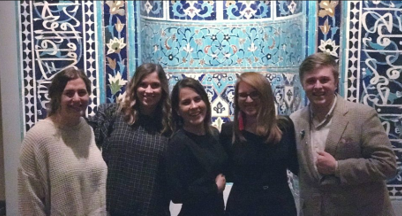 The GCWAC team at the Cincinnati Art Museum for Art after Dark for the first staff outing! Here we are standing in front of the Mihrab (prayer niche) that was formed in the late 15th or early 16th century in Iran or Central Asia. Devout Muslims pray five times a day while kneeling toward Mecca, Islams Holy City and the site of Allah’s revelation to the prophet Muhammad. Every mosque and prayer niche (like this one) faces in a specific direction. The niche itself commemorates the spot where the prophet stood while leading in congregational prayer.